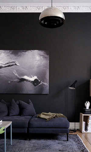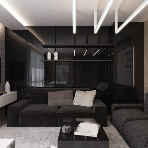 دیوار تمام مشکی مات در میانه ی فضای نشیمن قرار گرفته است و پرده های دراماتیک مشکی در دو طرف دیوار تمام پنجره، به سمت چپ کشیده شده اند.