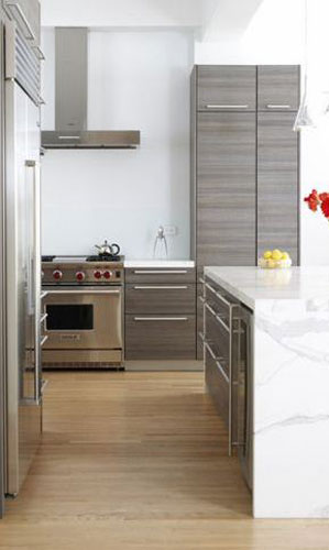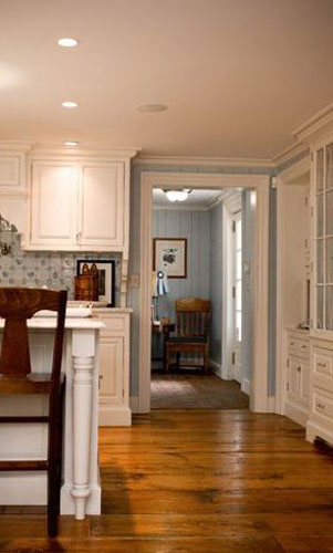 کفپوشهای سفید بلوطی معمولا بصورت سفید متمایل به زرد بنظر میرسند . وقتی کفپوشی را انتخاب میکنید باید رنگ چوب و مبلمان منزل خود را مد نظر داشته باشید . در اینجا درب گوشه پشتی رنگ گرمتری دارد و دیوار پشت اجاق ( شومینه ) قهوه ای گردوئی است . من کنجکاو هستم که بدانم چه صندلیهائ گردوئی برای این آشپزخانه استفاده میشود و مناسب است .