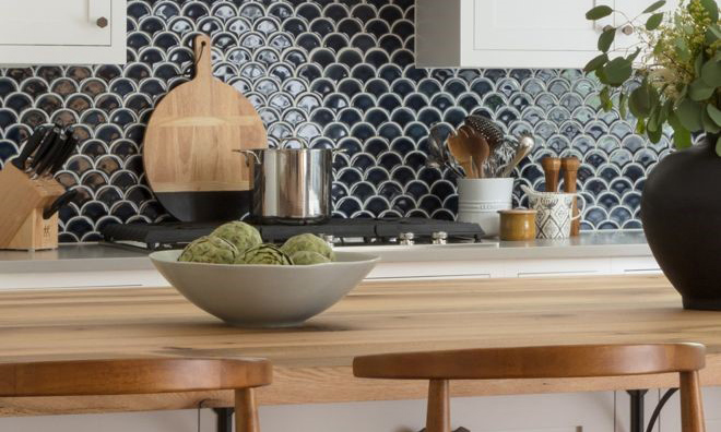 اگر از کاشی های خودتان خسته شده اید ولی همچنان یک محیط کلاسیک و ساده میخواهید از طرح فلس ماهی استفاده کنید . این منظره دارای حرکت و جنبش بیشتری است و جالبتر از کاشی های مستطیلی است . کار متنوعی است و میتواند در هر آشپزخانه ای از ان استفاده شود .