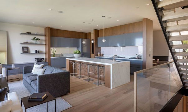 همچنان که در عکس مشاهده میکنید یک دیوار نیمه از کابینت ها فضای نیمه بسته ای بین آشپزخانه و اتاق نشیمن به وجود می آورد.