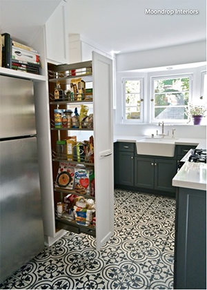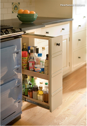 ۵. پوشش قفسه ها. استفاده از قفسه های ۱۵ اینچی کشویی در آشپزخانه بهتر می باشد. به این معنی که، شما تنها قفسه هایی را که نیاز دارید از محل خود خارج می کنید. همچنین، شما باید طراحی هر کابینت را هماهنگ با کاشی های کناری آن بر روی دیوار در نظر بگیرید. نوار لایی ( یک نوار تطبیقی با طرح چوب که فاصله بین کابینت و دیوار را پر می کند) حداقل عرض آن ۱.۵ اینچ می باشد. این نوار از صدمه دیدن دیوار به واسطه لبه های درب کابینت و همچنین از بین رفتن سطح کابینت ها جلوگیری می کنند.
